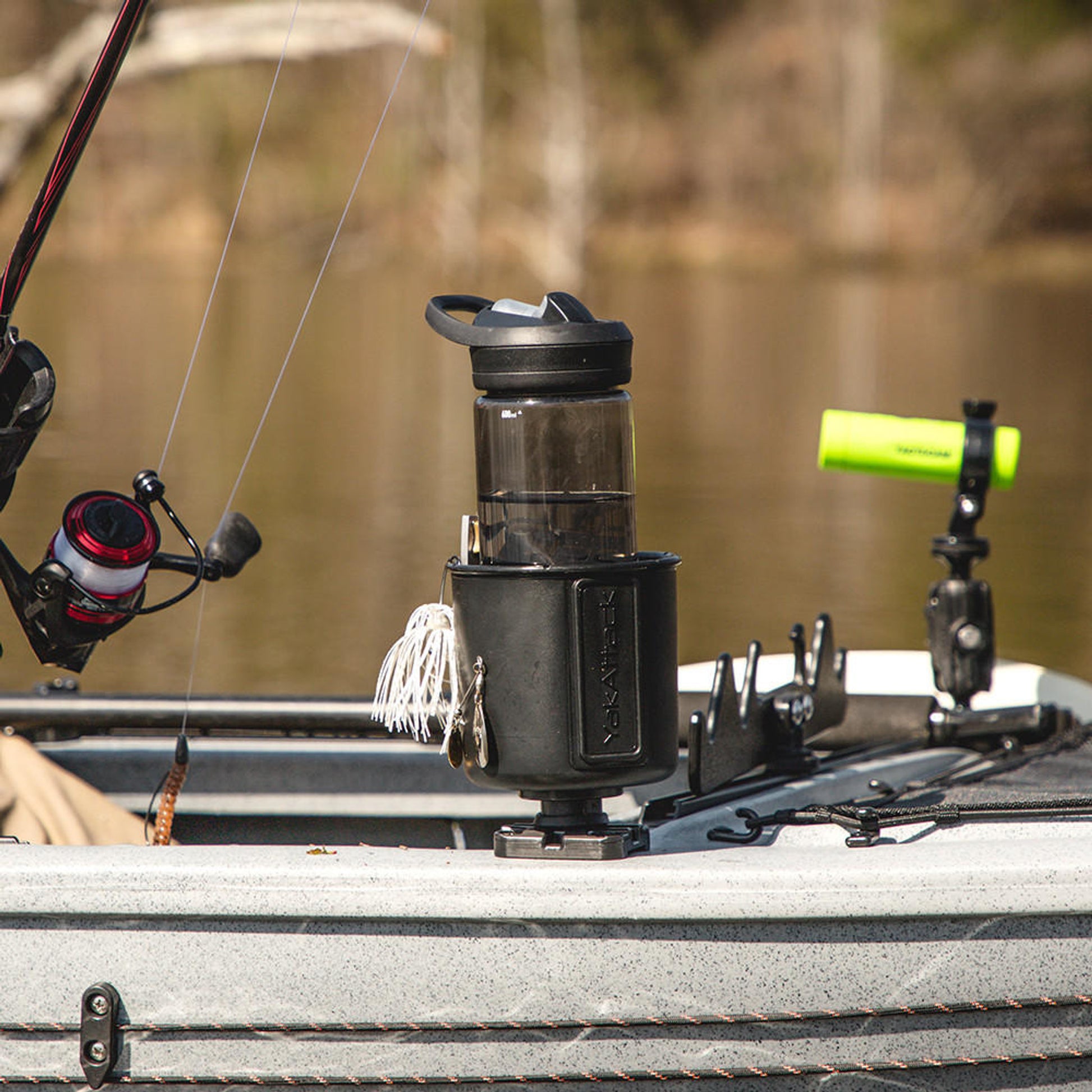 The YakAttack MultiMount Cup Holder quickly and easily attaches to most kayak track systems. Designed for maximum versatility, the MultiMount Cup Holder accepts anything from stainless steel tumblers to Nalgene® Bottles to 12 oz cans and water bottles. Not thirsty? The MultiMount Cup Holder also makes a great place to put small tools and other items! Made in the USA from premium materials for a lifetime of use in even the harshest environments. Compatible with YakAttack MightyMount’s, GearTrac, and most other kayak track systems from Scotty Fishing Products, RAM Mounts, and YakGear. For FeelFree Kayaks, 3 Water Kayaks, and Jonny Boats you will need an adapter to be compatible. We offer the needed adapter in a single pack (AAP-1012) and a six pack (AAP-1012-6).